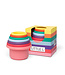 Ze zijn gemakkelijk af te wassen in heet water of in de vaatwasser voor uren speelplezier! Kinderen kunnen een toren bouwen, vormen maken, ze sorteren van klein naar groot, ze gebruiken als keukengerei tijdens symbolisch spel, als bakjes om voorwerpen van de ene kom naar de andere te brengen, in bad of op nog veel meer manieren. Vanaf de geboorte.