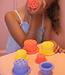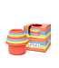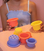 Ze zijn gemakkelijk af te wassen in heet water of in de vaatwasser voor uren speelplezier! Kinderen kunnen een toren bouwen, vormen maken, ze sorteren van klein naar groot, ze gebruiken als keukengerei tijdens symbolisch spel, als bakjes om voorwerpen van de ene kom naar de andere te brengen, in bad of op nog veel meer manieren. Vanaf de geboorte.