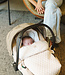 Beige engelennestje voor een 3-punts autostoel. De een bovenkant is veilig is gesloten met drukknoopjes. Gemaakt van zachte gestikte katoen met fijne beige biesjes en een borduursel van het 'FIRST' kroontje, is het zowel comfortabel als chic.
