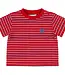 Gestreepte rood/blauw/witte T-shirt met ronde hals en korte mouw afgewerkt met een borstzakje. Tot en met 2 jaar is deze T-shirt voorzien van drukknopen aan de schouder zodat het makkelijk is om aan te doen.