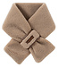 Een beige, teddy sjaal. De sjaal is heel gemakkelijk te sluiten door een schuif-systeem met een leren detail.