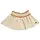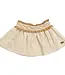 Een ribfluwelen rok met beige ruffles en gekruiste lint aan de verstelbare tailleband. De rok heeft een ritssluiting en aanpasbare tailleband.