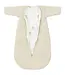 De slaapzak heeft een rits die van boven tot helemaal beneden open te ritsen is, zodat je je baby er makkelijk in kunt leggen. Door de afritsbare mouwen eraf te halen kun je de slaapzak iets minder warm maken.